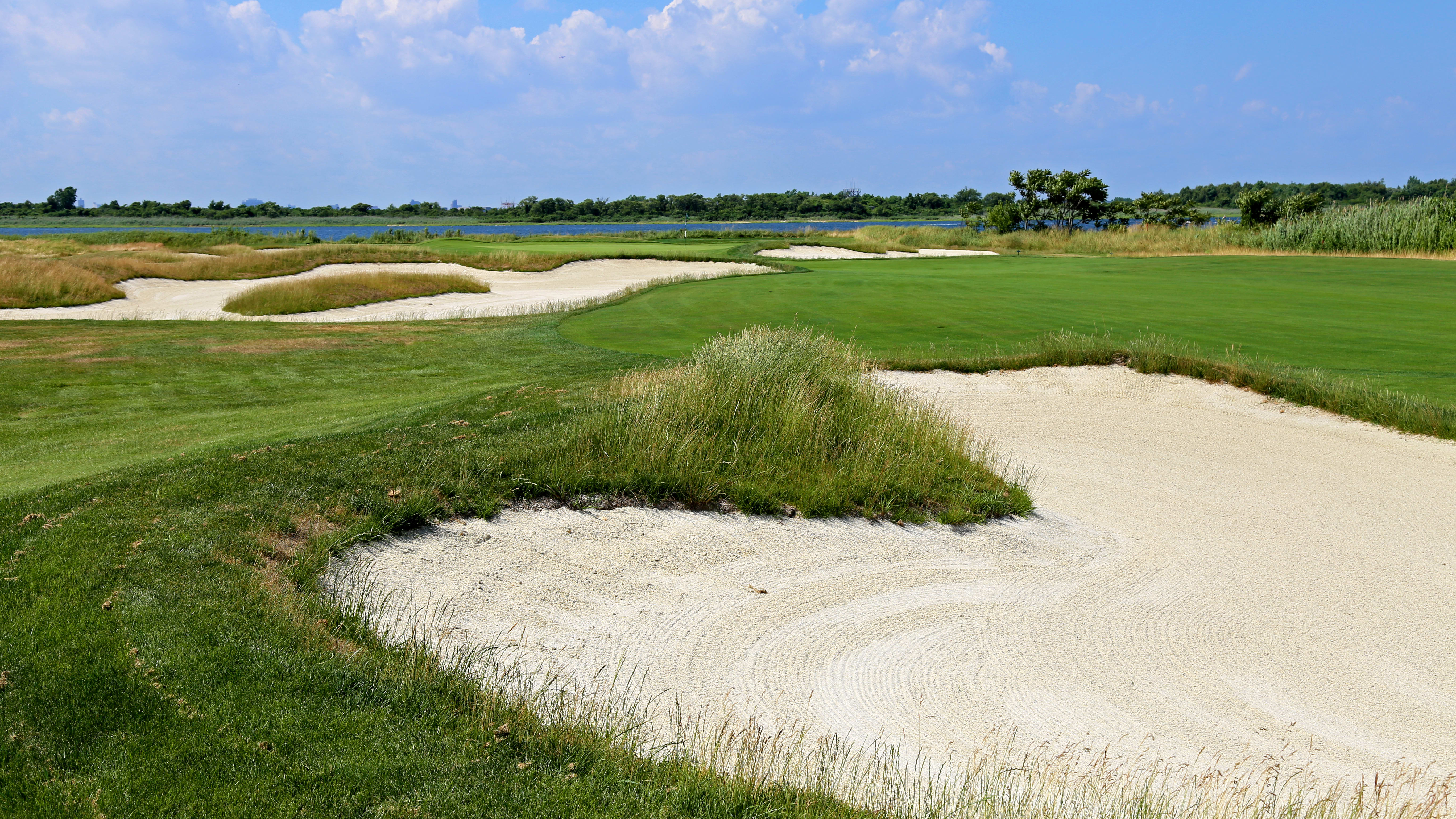 A view of the 12th green guarded by sand traps at Lakewood Country Club.